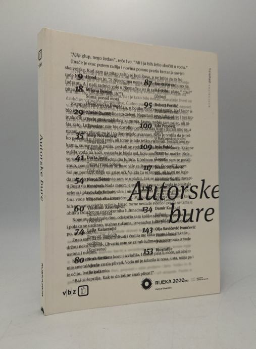 Autorske bureUrednik: Kruno LokotarZbornik „Autorske bure“ koncipiran je na jedinstven način, s obzirom na slogan projekta Rijeka 2020 – Europska prijestolnica kulture: „Luka različitosti“. Odabrani, renomirani, vrlo različiti autori i autorice „bhsc“ jezika, mjesec su dana živjeli u pojasu, opet vrlo različitih, lokalnih zajednica uokolo Kvarnerskog zaljeva. Zadaća im je bila gledati, upijati i nakon mjesec dana boravka napisati kratku priču koja se na neki način tiče zajednica u kojima su boravili. Naravno, bilo je ne samo poželjno, nego i neizbježno, da se priče tiču i autora.Kao što je bilo neizbježno i da kao rezultat toga nastane zbornik vrlo različitih priča. Zato ćete unutar korica ove knjige naći priče koje počivaju na dnevničkim zapisima, zaigrano-eksperimentalne, SFantasy, lirsko-refleksivne, neorealističke, horor i svakakve druge priče.Jer različitost je obilje.Kruno LokotarStranica: 167Dimenzije: 14x20Jezik: ZagrebPismo: LatinicaStanje: OdličnoUvez: MekiGodina: 2019