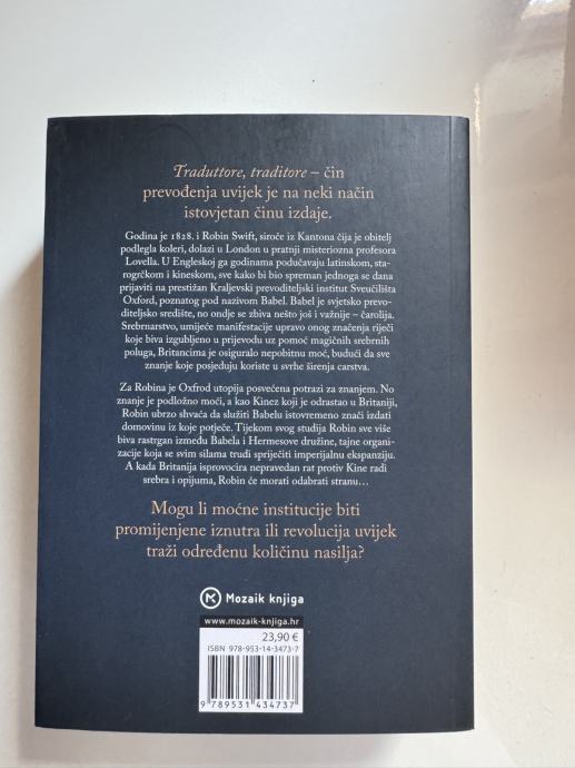 "Babel" je međunarodni bestseler i dobitnik brojnih književnih nagrada. Ova povijesna fantasy priča smještena je u 19. stoljeće i istražuje moć jezika, kolonijalizam i društvene promjene kroz napetu radnju i nezaboravne likove. Knjiga je oduševila čitatelje diljem svijeta i smatra se jednim od najvažnijih romana suvremene književnosti.