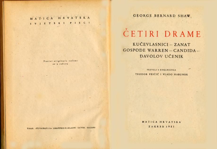Prijevodi djela: 1. Widowers houses ; 2. Mrs. Warren's profession ; 3. Candida ; 4. The devil's disciple.