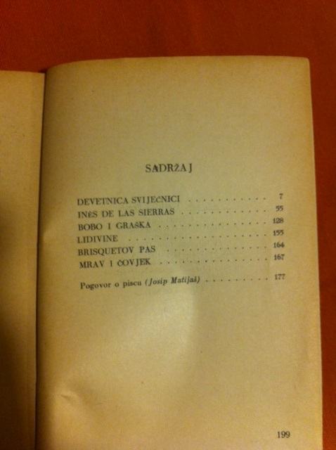 Ova zbirka novela poznatog francuskog književnika u Zorinom izdanju iz 1953. godine sadrži ove novele: Devetnica svijećnici, Ines se las Sierras, Bobo i graška, Lidivine, Brisquetov pas i Mrav i čovjek.