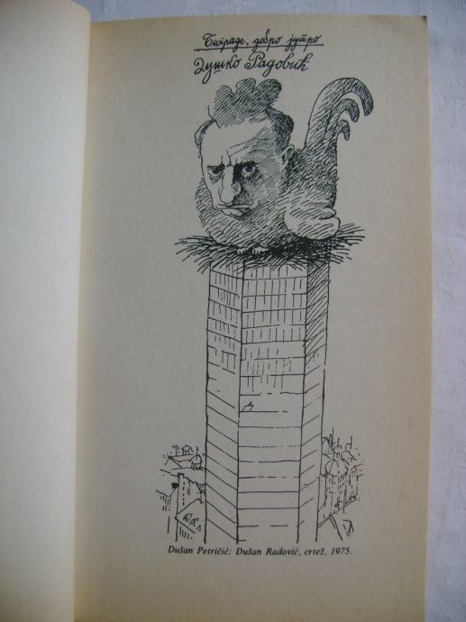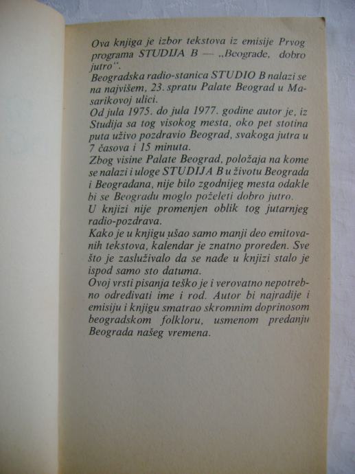 "Dušan Radović se bavio najraznovrsnijim novinarskim i književnim poslovima, ali je tek u STUDIJU B - radio emisiji, progovorio. Kako sam kaže: "Nije bilo zgodnijeg mjesta odakle bi se Beogradu moglo poželjeti dobro jutro. Zbog visine zgrade "Beograd", položaja na kome se nalazi i uloge STUDIJA B u životu Beograda i Beograđana".