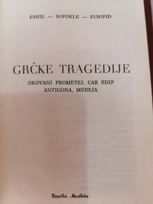 ESHIL - SOFOKLE - EURIPID: GRČKE TRAGEDIJE ( OKOVANI PROMETEJ, CAR EDIP, ANTIGONA, MEDEJA), izdanje Veselin Masleša, Sarajevo 1985., prijevod Miloš N. Đurić, tvrde korice, 322 str.