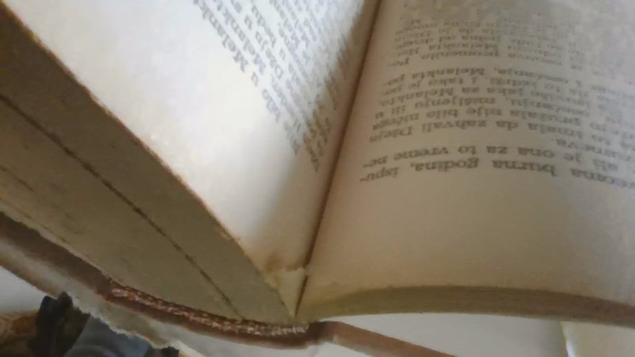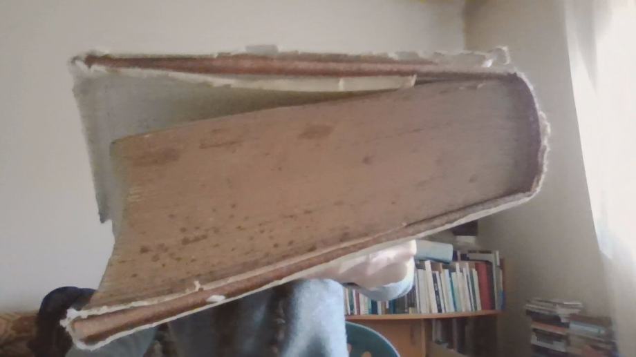 VANJSKI OMOT IMA DOSTA OŠTEĆENJA I MRLJA, KORICE IMAJU OŠTEĆENJA I MRLJE, MRLJE PRI RUBOVIMA STRANICA I UNUTAR KNJIGE, PREGIB UGLA JEDNE STRANICE, NEKOLIKO OŠTEĆENJA UNUTAR KNJIGE