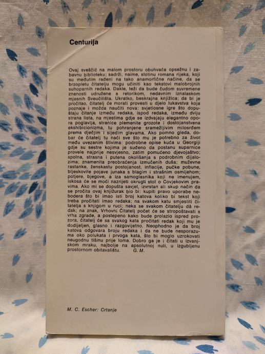 Ovaj sveščić na malom prostoru obuhvaća opsežnu i zabavnu biblioteku; sadrži, naime, stotinu romana rijeka, koji su međutim rađeni na tako anamorfične načine, da se brzopletu čitatelju mogu učiniti kao tekstovi malobrojnih suhoparnih redaka. Dakle, teži da bude čudom suvremene znanosti udružene s retorikom, nedavnim iznalaskom mjesnih Sveučilišta. Ukratko, beskrajna knjižica; da bi je pročitao, čitatelj će morati provesti u djelo lukavstva koja poznaje i možda naučiti nova: svjetlosne igre što dopuštaju čitanje izmedu redaka, ispod redaka, između dviju strana lista, na mjestima gdje se izdvajaju elegantno opora poglavlja, stranice plemenite grozote i dostojanstvena ekshibicionizma, tu pohranjene sramežljivim milosrđem prema dječjim i sijedim glavama. Ako pomno gleda, dobar će čitatelj tu naći sve što mu je potrebno za život među uvezanim štivima: podrobne opise kuća u Georgiji gdje su sestre kojima je suđeno da postanu suparnice provele najprije nesvjesno, zatim pomućeno djevojaštvo; spolna, strasna i putena okolišanja s podrobnim dijalozima; znamenita preobraćenja izmučenih duša; muževne rastanke, ženskastu postojanost, inflacije, pučke pobune, bljeskovite pojave junaka s blagim i strašnim osmijehom; potjere, bjegove, a iza samoglasnika koji ne imenujem, iskosa će se moći nazrijeti okrugli stol o Čovjekovim pravima. Ako mi se dopušta savjet, izvrstan ali skup način da se pročita ovaj knjižurak bio bi: kupiti pravo uporabe nebodera što bi imao isti broj katova koliko bi tekst koji treba pročitati imao redaka; na svakom katu smjestiti čitatelja s knjigom u ruci; neka se svakom čitatelju da redak; na znak, Vrhovni Čitatelj počet će se stropoštavati s vrha zgrade, a postepeno kako bude prolazio ispred prozora, čitatelj će sa svakog kata pročitati redak koji mu je dodijeljen, glasno i razgovijetno. Neophodno je da broj katova odgovara broju redaka i da ne bude nesporazuma oko polukata i prvoga kata, što bi moglo uzrokovati neugodnu tišinu prije loma. Dobro ga je i čitati u izvanjskom mraku, najbolje na apsolutnoj nuli, u izgubljenu prostornom obitavalištu.