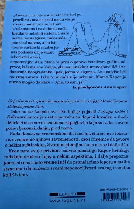 Hej, nisam ti to pričala nastavak je kultne knjige Mome Kapora Beleške jedne Ane. Iako su se između ove dve knjige pojavili I druge priče i Foliranti, autor je osetio potrebu da dopuni hroniku o tinejdžerki Ani sa novih sedamnaest poglavlja koja su sada, u ovom ponovljenom izdanju, pred nama. Kada danas, sa vremenskom distancom, čitamo ove tekstove, svesni smo njihove savremenosti, kao i činjenice da govore o nekim suštinskim, životnim pitanjima koja nas se i dalje tiču. Kroz usta svoje prividno naivne junakinje Kapor kritikuje tadašnje društvo koje, u nekim aspektima, i dalje prepoznajemo, ali nas u isto vreme i uči da pronalazimo lepotu u malim stvarima i da budemo svesni neponovljivosti svakog trenutka koji živimo.