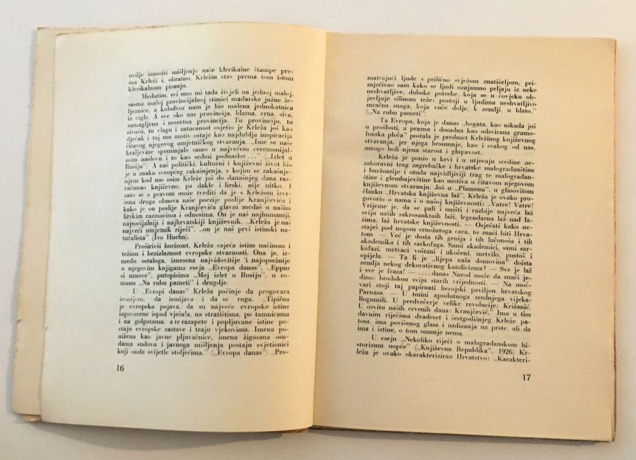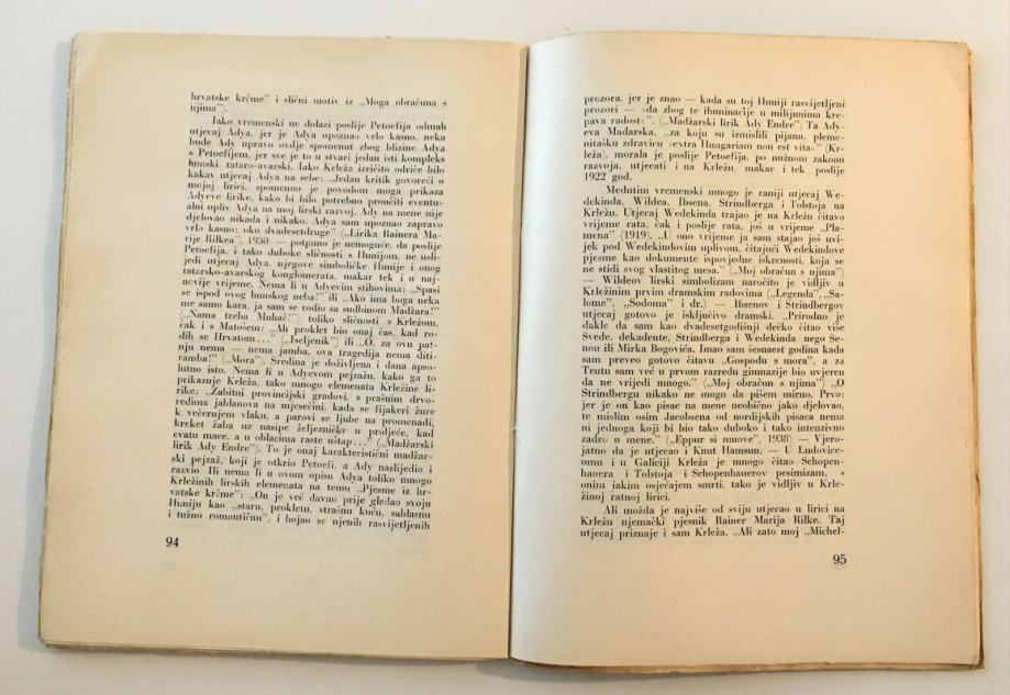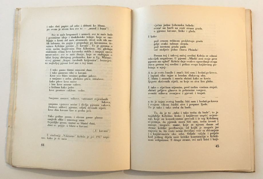 Preuzeto iz knjige: “Krležina lirika kadgod je odviše deklamatorska, nategnuta, prejako osvijetljena bengalskom vatrom, sva zapjenušana od apstraktnih riječi i pojmova, ali ona će u svojim najboljim primjercima ostati nešto najboljeg, što je otsvirano na našem lirskom instrumentu otkad traje te naše lirike i književnosti; lirika je to, kojoj je ravna samo onih rijetkih i najvećih, da, iznimnih imena, kao što su kod nas Kranjčević, Matoš, Nazor i jedva još tko. Krleža znači konačnu našu lirsku progovorenost. On je književnik koji u ovoj zemlji najviše piše. Jedini pravi profesionalni književnik u našoj zemlji u evropskom smislu.”