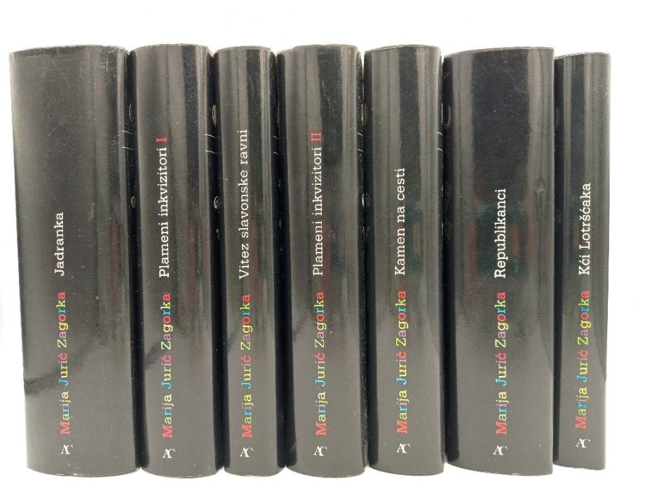Marija Jurić Zagorka: Jadranka I-VII.Komplet od 7 knjiga:1. Jadranka, 708 str.2. Plameni inkvizitori I., 480 str.3. Plameni inkvizitori II., 484 str.4. Republikanci, 632 str.5. Kamen na cesti, 446 str.6. Kći Lotrščaka, 305 str.7. Vitez Slavonske ravni, 343 str. Stranica: 708+480+484+632+446+305+343Dimenzije: 16x23Jezik: ZagrebPismo: LatinicaStanje: OdličnoUvez: Tvrdi s ovitkomGodina: 1987
