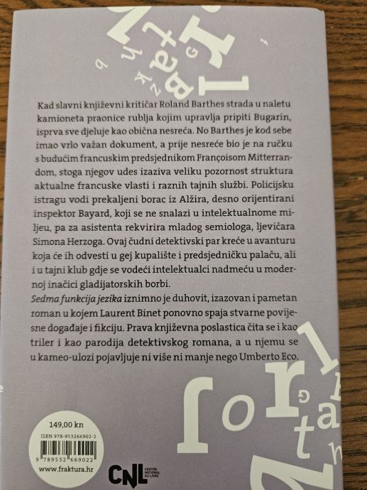 Sedma funkcija jezika iznimno je duhovit, izazovan i pametan roman u kojem Laurent Binet ponovno spaja stvarne povijesne događaje i fikciju. Prava književna poslastica čita se i kao triler i kao parodija detektivskog romana, a u njemu se u kameo-ulozi pojavljuje ni više ni manje nego Umberto Eco.