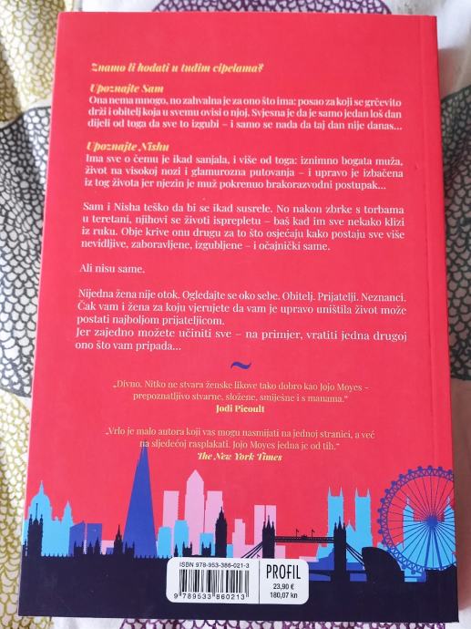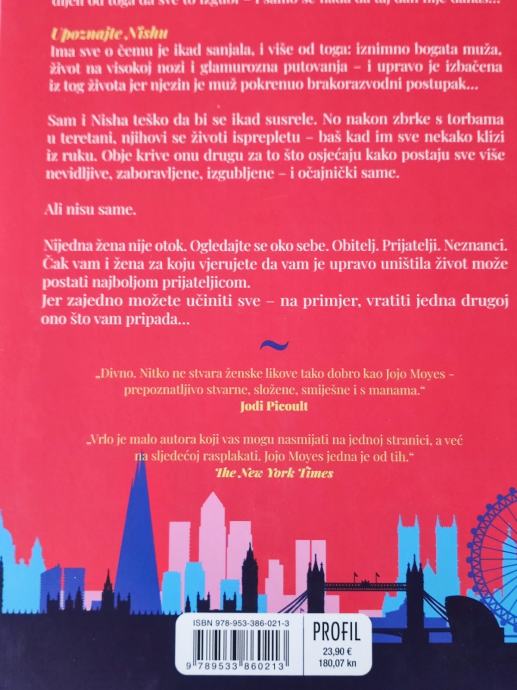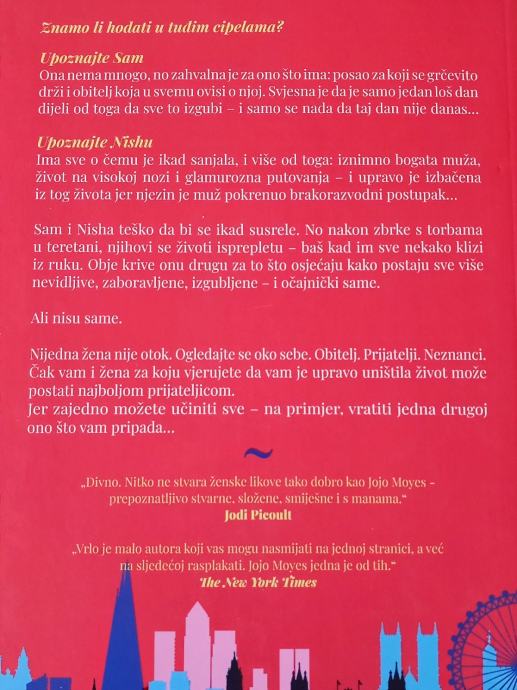 Upoznajte Sam. Ona nema mnogo, no zahvalna je za ono što ima: posao za koji se grčevito drži i obitelj koja u svemu ovisi o njoj. Svjesna je da je samo jedan loš dan dijeli od toga da sve to izgubi – i samo se nada da taj dan nije danas…Upoznajte Nishu. Ima sve o čemu je ikad sanjala, i više od toga: iznimno bogata muža, život na visokoj nozi i glamurozna putovanja – i upravo je izbačena iz tog života jer njezin je muž pokrenuo brakorazvodni postupak… Sam i Nisha teško da bi se ikad susrele. No nakon zbrke s torbama u teretani, njihovi se životi isprepletu – baš kad im sve nekako klizi iz ruku. Obje krive onu drugu za to što se osjećaju kako postaju sve više nevidljive, zaboravljene, izgubljene – i očajnički same. Ali nisu same. Nijedna žena nije otok. Ogledajte se oko sebe. Obitelj. Prijatelji. Neznanci. Čak vam i žena za koju vjerujete da vam je upravo uništila život može postati najboljom prijateljicom. Jer zajedno možete učiniti sve – na primjer, vratiti jedna drugoj ono što vam pripada…