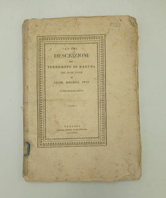 Stjepan Gradić: Le tre descrizioni del terremoto di Ragusa del M.DC.LXVII Prvo izdanje. Talijanski prijevod s latinskog triju opisa potresa u Dubrovniku 1667. godine. Tragovi korištenja, ponajviše zbog mekog uveza. Sadrži: predgovor / posvetu Luke Stullija Nikoli Androviću (str. 3 - 23), Gradićevu poemu o potresu (str. 25 - 36), Rogačićevu poemu o potresu (str. 37 - 42), Stojkovićevu poemu o potresu (str. 43 - 50), poemu Luke Stullija u povodu smrti Tommasa Cherse (str. 51 - 60). U predgovoru Stulli iznosi prvu hrvatsku kritiku Gundulićeva Osmana.Regije: DubrovnikZemljovid: nema Gradi, StefanoStjepan Gradić (Dubrovnik, 6. 3. 1613. - Rim, 2. 5. 1683.) - hrvatski znanstvenik, pjesnik, polihistor i doplomat. Studirao filozofiju i teologiju u Rimu te pravo u Bolonji, gdje je 1638. stekao doktorat. Od 1653. živio je u Rimu. Od 1661. bio je kustos, a od 1682. predstojnik Vatikanske knjižnice. Obnašao dužnost predsjednika hrvatske bratovštine svetog Jeronima u Rimu. Bavio se matematikom, fizikom, filofogijom i književnim radom. Benedikt Rogačić (Dubrovnik, 18. 3. 1646. - Rim, 8. 2. 1719.) - hrvatski teolog, gramatičar i pjesnik; isusovac. Studirao u Anconi i Rimu. Poučavao Filozofiju u Germanicumu. Cijeli život djelovao u Rimu. Objavio je desetak djela na latinskom i talijanskom, a bavio se i prevođenjem. Benedikt Stay Stojković (Dubrovnik, 1714. - Rim, 25. II. 1801.) - hrvatski filozof i latinist. U Dubrovniku završio isusovački kolegij, potom u Rimu studirao filozofiju, matematiku i teologiju. Od 1742. profesor retorike i povijesti na Visokoj papinskoj školi u Rimu. Obavljao mnoge diplomatske službe u Vatikanu. Autor je dviju filozofskih poema. Luko (Luka) Stulli (Šumet kraj Dubrovnika, 22. IX. 1772. - Dubrovnik, 12. 9. 1828.) - hrvatski liječnik i književnik. U Bolonji završio studij filozofije i medicine. U Dubrovniku obnašao dužnosti gradskog fizika, bolničkog primarijusa i nadzornika svih bolnica. Član rimske Accademije degli Arcadi. U hrvatske krajeve uveo cijepljenje protiv boginja. Pisao medicinska, prirodoznanstvena i književna djela.Stranica: 60Dimenzije: 17x23.5Jezik: VenecijaPismo: LatinicaStanje: Vrlo dobroUvez: MekiGodina: 1828