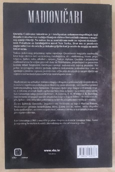 Prodajem roman Mađioničari autora Leva Grossmana, bestseller New York Timesa. Radi se o prvom dijelu istoimene trilogije koja prati Quentina Coldwatera, talentiranog i inteligentnog sedamnaestogodišnjaka koji odrastajući sanja o magiji i čarobnim svjetovima. Kada neočekivano bude primljen na tajni Fakultet za čarobnjaštvo smješten negdje u New Yorku, shvaća da magija zaista postoji, no stvarnost se pokazuje složenijom i tamnijom nego što je ikad zamišljao. Roman spaja elemente fantastike s psihološkom dubinom likova i nudi svojevrsnu odraslu verziju priča o čarobnjacima. Izdavač je VBZ Zagreb 2010 g.,meki je uvez od 391 str.,odlično je očuvana knjiga.