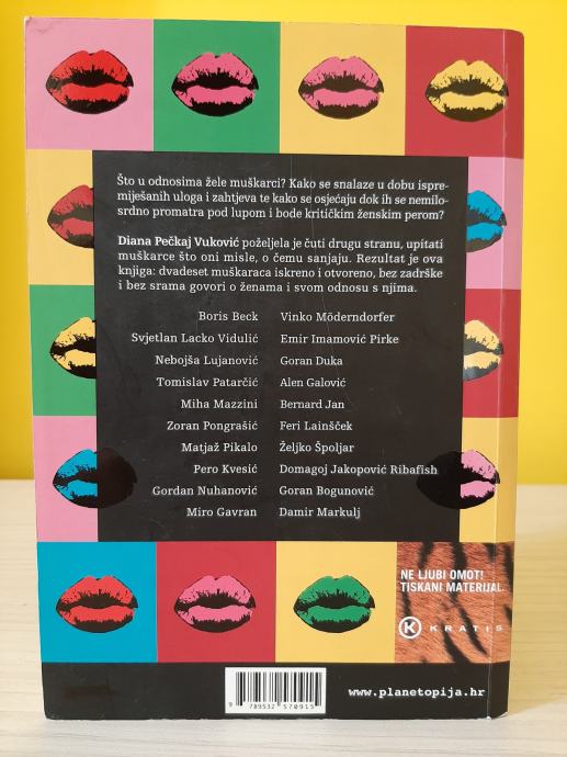 20 literarnih eseja hrvatskih, slovenskih i bosanskih pisaca, ženski je strpljivo ali i odlučno prikupila Diana Pečkaj Vuković, novinarka i scenaristica jer je poželjela „čuti i drugu stranu". Svim je autorima zadana ista tema - što u odnosima žele muškarci? Kako se snalaze u dobu ispremiješanih uloga i zahtjeva te kako se osjećaju dok ih se nemilosrdno promatra pod lupom i bode kritičkim ženskim perom? Kao lajtmotiv urednica je uzela grafit koji je uočila na zagrebačkoj gornjogradskoj fasadi „U svojim snovima ljubim tvoje usne 1000 puta". Tko ga je napisao? Povijest književnosti puna je silovitih i nadahnutih muških ljubavnih izjava, ali gdje su te strasne riječi u našoj svakodnevici? Dvadeset literarnih eseja, svaki toliko različit koliko i njihovi autori, čitaju se bez daha, kao roman u malom, kao jedan drugačiji i poticajni doprinos muško-ženskom dijalogu.