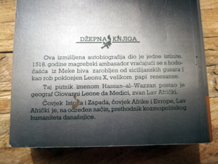 Prijevod Vladimira Mirković - Blažević. Biblioteka Džepna knjiga. Prijevod djela: Leon l'Africain. Francuska književnost. Romani. Duže pripovijetke. Francuska književnost u Africi. Romani, novele, pripovijetke. LAV AFRIKANAC. Francuska književnost u Africi. Romansirana biografija o Lavu Afrikancu. Francuska književnost. Romani, novele, pripovijetke. Arapska književnost. Romani, novele, pripovijetke.