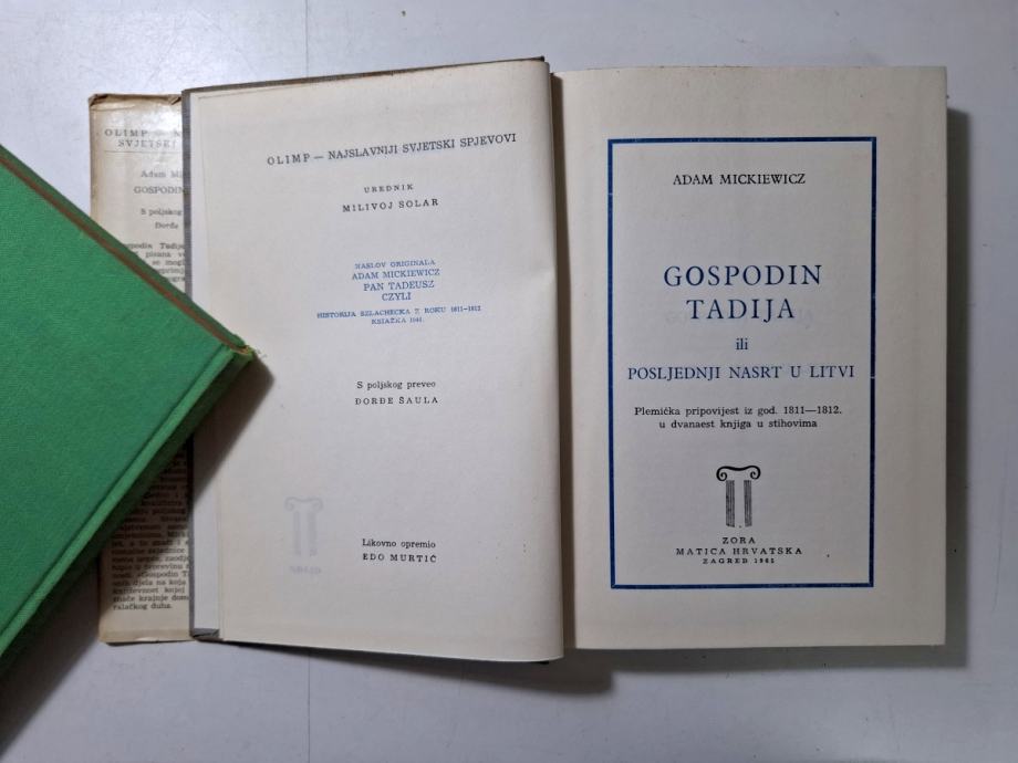 Adam Mickiewicz. S poljskog preveo Đorđe Šaula. Pogovor Zdravko Malić. Prijevod djela: Pan Tadeusz czyli Ostatni zajazd na Litwie.