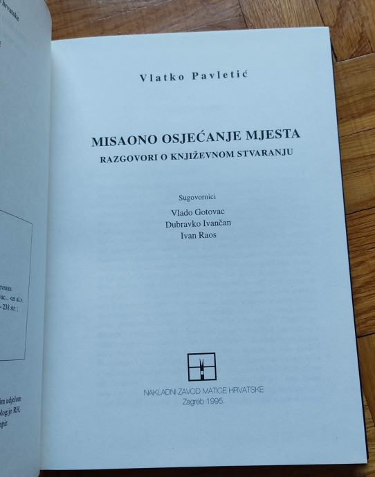 Prodajem knjigu Misaono osjećanje mjesta, Razgovori o književnom stvaranju, autor Vlatko Pavletić, izdavač Nakladni zavod Matice Hrvatske, 1995. godina. Knjiga ima 237 stranica i bez oštećenja je. Imam više komada.