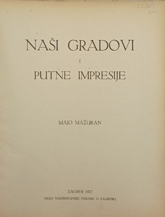 Majo Mažuran: Naši gradovi i putne impresijeIzdano povodim 1000 godišnjice Hrvatskog Kraljevstva Stranica: 47Dimenzije: 23.5x28.5Jezik: ZagrebPismo: LatinicaStanje: DobroUvez: TvrdiGodina: 1927