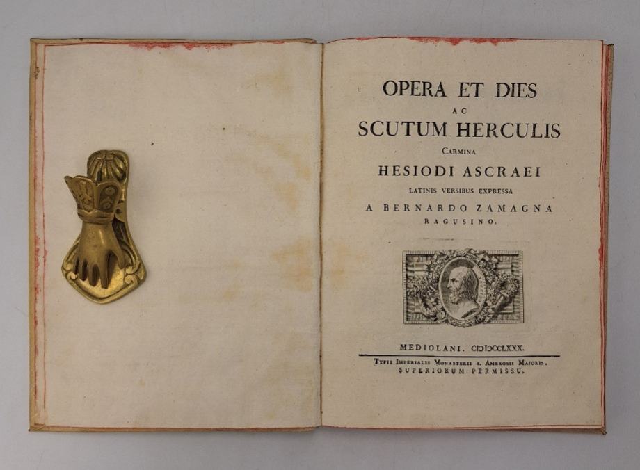 Hesiod: Opera et dies ac Scutum Herculis. Carmina Hesiodi Ascraei Latinis versibus expressa a Bernardo Zamagna Ragusino.Izraženo latinskim stihovima Bernarda Zamanje.Stranica: 96Dimenzije: 19x25Jezik: MilanoPismo: LatinicaStanje: Vrlo dobroUvez: TvrdiGodina: 1780