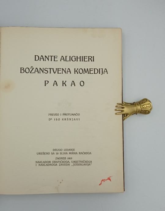 Dante Alighieri: PakaoBožanstvena komedijaPakaoPreveo i protumačio: Dr. Iso KršnjaviDrugo izdanjeurešeno sa 30 slika Mirka RačkogaDrugo izdanje urešeno sa 30 slika Mirka Račkog.Božanstvena komedija sastoji se od tri dijela, Pakla (Inferno), Čistilišta (Purgatorio) i Raja (Paradiso) koji redom imaju 34 (uvodno pjevanje i još 33 pjevanja), 33 i 33 pjevanja, a ukupno čine preko 14,000 redaka. Prvi dio komedije, Pakao, je najpoznatiji te se često objavljuje odvojeno pod nazivom “Danteov Pakao”. Broj 3 kao simbol iznimno je važan u ovom djelu – dužina djela (po 33 pjevanja), strofa kojom je spjev pisan je tercina, tri zvijeri napadaju Dantea u uvodnom pjevanju, a broj tri također je i simbol Svetog Trojstva. Važnu ulogu ima i broj 100 koji je bio smatran savršenim brojem (uvodno pjevanje i tri dijela po 33 pjevanja). Strofe se također sastoje od tri retka, a rima ide po shemi: aba bcb cdc ded …Pjesnik u prvom licu govori o svojem putovanju kroz tri dijela zagrobnog života u vrijeme Uskrsa godine 1300, na “polovici svog životnog puta”, odnosno u 35. godini. Kroz Pakao i Čistilište vodi ga rimski pjesnik Vergilije, autor Eneide kojem se Dante divio, a kroz Raj ga vodi Beatrice, Danteova vizija savršene žene. Beatrice je bila stvarna žena iz Firence koju je Dante sreo u djetinjstvu i kojoj se iz daljine divio. Vergilije nije mogao voditi Dantea kroz Raj zbog toga što je Vergilije nekršten i nalazi se u Limbu (1. krugu Pakla).Posljednja riječ svih dijelova Božanstvene komedije je “zvijezde” (tal. stelle) Stranica: 141Dimenzije: 26x34Jezik: ZagrebPismo: LatinicaStanje: Vrlo dobroUvez: TvrdiGodina: 1919