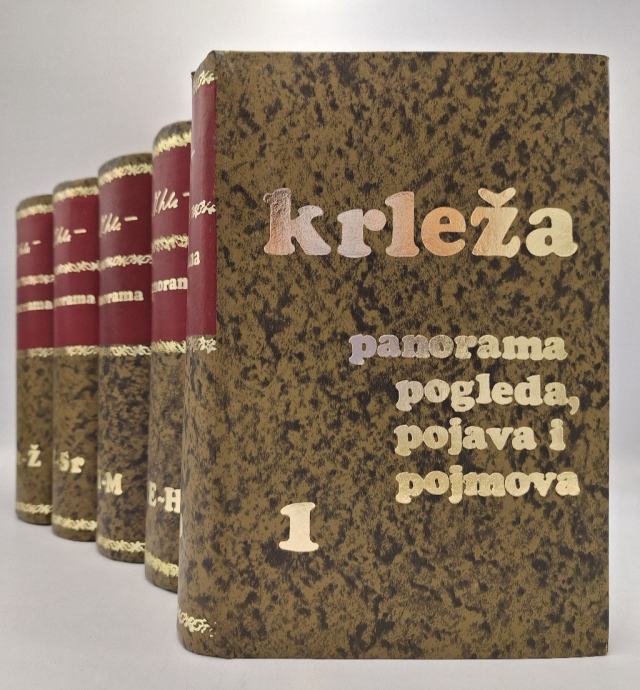 Miroslav Krleža: Panorama pogleda, pojava i pojmova I - V. Jubilarno izdanje u povodu 80-te godišnjice života autora. Ova »Panorama pogleda, pojava i pojmova«, poznatija pod svojim »radnim« naslovom »Krležijana«, sadržava niz citata izabranih iz gotovo cjelokupnog proznog djela Miroslava Krleže /eseji, politička i ostala publicistika, beletristika, dnevnici itd./, objavljenog u vremenskom rasponu od 1913. do 1975. godine. Citati su birani prema načelu da svaki od njih dade što zaokruženiju, što cjelovitiju autorovu misao o jednoj ličnosti iz bogate Krleži-ne galerije domaćih i stranih likova svih epoha ili o jednom problemu: književnom, slikarskom, kiparskom, muzičkom, filozofskom u najširem smislu, moralnom, društvenom, povijesnom, medicinskom ili ma kojem drugom iz goleme lepeze problema o kojima je Krleža u toku svoje dugogodišnje književne aktivnosti razmišljao i pisao, a naročito o temeljnim pitanjima čovjekove egzistencije: otkuda, čemu i kamo?, tj. o položaju »blijedog dvonošca« u svemiru i historiji, o čovjeku suočenom sa tajnom života, smrti i poezije."Stranica: 773+ 894 +870+ 798+ 768Dimenzije: 14x20.5Jezik: ZagrebPismo: LatinicaStanje: Vrlo dobroUvez: TvrdiGodina: 1975