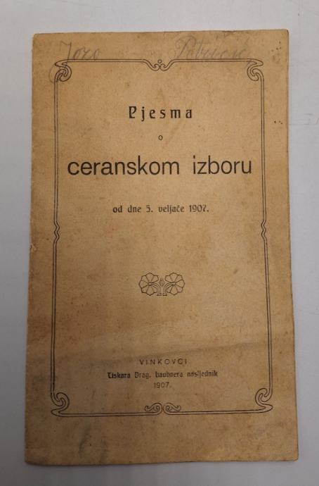 Pjesma o ceranskom izboru Stranica: 15Dimenzije: 10x16.5Jezik: VinkovciPismo: LatinicaStanje: DobroUvez: MekiGodina: 1907