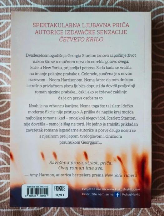 Noah je na vrhuncu karijere. Nema toga što taj zlatni dečko moderne fikcije nije postigao. A prilika da napiše kraj možda najboljeg romana ikad – onog koji njegov idol, Scarlett Stanton, nije dovršila – samo je šlag na torti. No jedno je smisliti prikladan završetak romana legendarne autorice, a posve drugo nositi se s njezinom prelijepom, tvrdoglavom i ciničnom praunukom Georgijom…