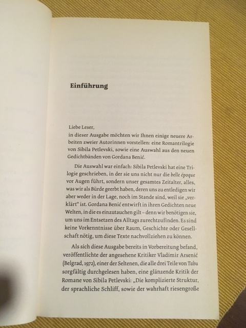 na njemačkom jeziku posvećen izboru iz poezije Gordane Benić i trilogiji "Tabu" Sibile Petlevski,