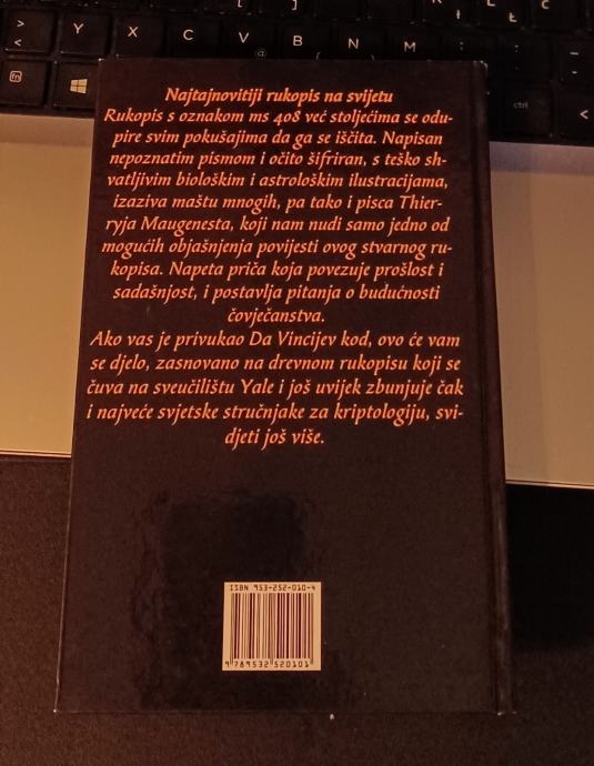 "Rukopis s oznakom ms 408 već stoljećima se odupire svim pokušajima da ga se iščita. Napisan nepoznatim pismom i očito šifriran, s teško shvatljivim biološkim i astrološkim ilustracijama, izaziva maštu mnogih, pa tako i pisca Thierryja Maugenesta, koji nam nudi samo jedno od mogućih objašnjenja povijesti ovog stvarnog rukopisa. Kroz napetu priču koja povezuje prošlost i sadašnjost, i postavlja pitanja o budućnosti čovječanstva..."