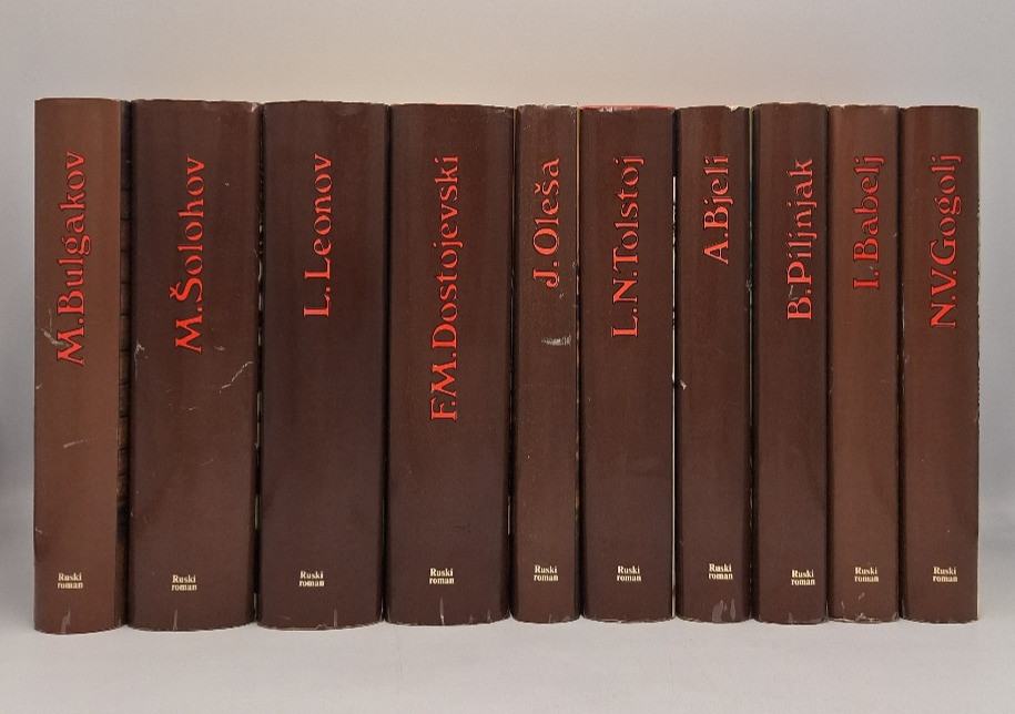 Ruski roman u 10 knjiga:1) N. V. Gogolj: Mrtve duše2) M. Bulgakov: Majstor i Margarita3) M. Šolohov: Uzorana ledina4) B. Piljnjak: Gola godina; Mećava5) A. Bjeli: Petrograd6) I. Babelj: Crvena konjica; Odeske priče7) L. N. Tolstoj: Uskrsnuće8) F. M. Dostojevski: Bjesovi9) J. Oleša: Zavist10) L. Leonov: Lopov Stranica: 400+434+765+267+362+270+483+776+232+733Dimenzije: 13x21.5Jezik: ZagrebPismo: LatinicaStanje: Vrlo dobroUvez: Tvrdi s ovitkomGodina: 1980