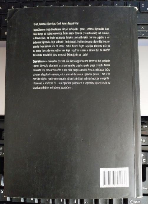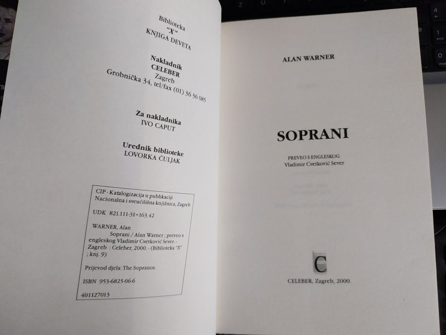 "....Alan Warner: SopraniŠkotski autor, pripadnik tzv. "generacije X", dobitnik je uglednih britanskih nagrada za književnost, a roman "Soprani" bit će njegovo drugo ekranizirano djelo. Ovo je zanimljiv roman i po temi i po stilu kojim je pisan. Priča je to o djevojačkom zboru škole "Naše Gospe od trajne pomoćnice" koji kreće na međuškolsko natjecanje. Došavši u grad, djevojke, članice zbora, kao jato ptica rasprše se po buticima, kafićima, čak i bordelu, a na meti im se nađe i podmornica i mornari koji su upravo uplovili u luku. Roman o godinama u kojima mlade djevojke ulaze u svijet odraslih..."