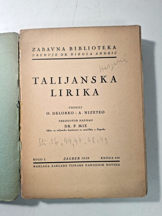 Talijanska lirika. Uredili Olinko Delorko i A. Nizeteo. Predgovor napisao P. Mix.