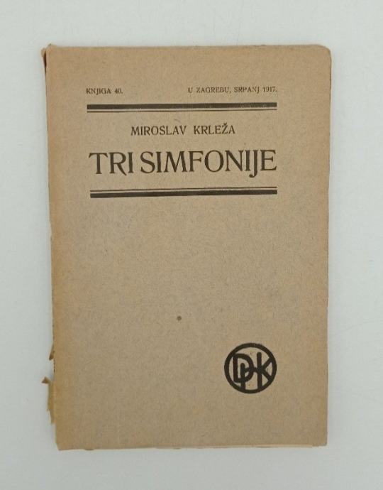 Miroslav Krleža: Tri simfonijePrvo izdanje iz 1917.Drugi objavljeni rad Miroslava Krleže.Rijetko, odlično uščuvano Stranica: 123Dimenzije: 13.5x20Jezik: ZagrebPismo: ĆirilicaStanje: DobroUvez: MekiGodina: 1917