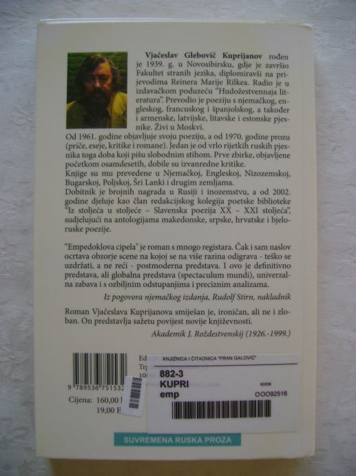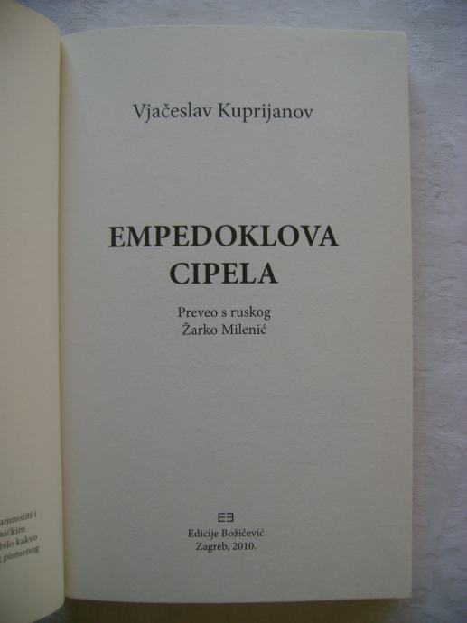 Vjačeslav Kuprijanov - Empedoklova cipela - izdavač Edicije Božičević, Zagreb 2010. godine, meki uvez171 stranica. Knjiga je otpisana iz knjižnice, ali je nova, nečitana - stanje je vidljivo na slikama.