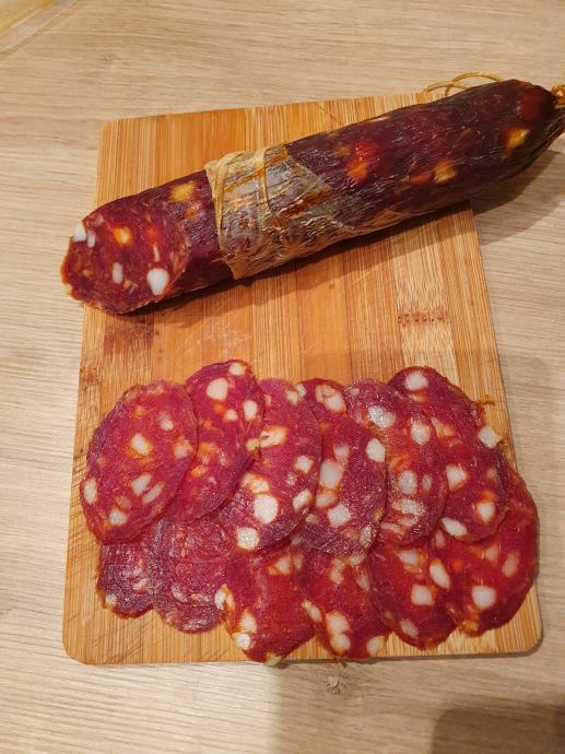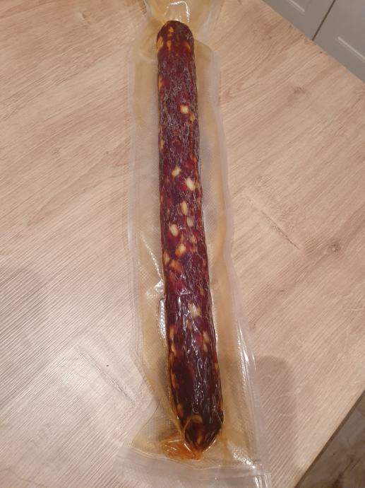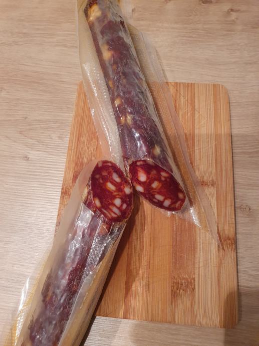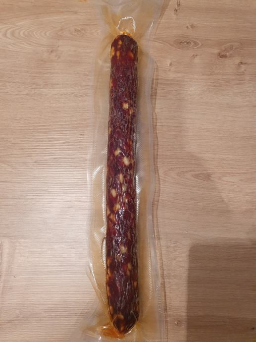 Prodajem manju količinu vrlo kvalitetnih i ukusnih domaćih kobasica, napravljenih na principu kulenove seke. Korištena je isključivo i 100% domaća svinjetina (čisto najkvalitetnije meso buta, lopatice, karea + tvrdi leđni špek sjeckan na kockice), začinjene su slavonskom ljutom paprikom. Imam manje ljutu i više ljutu verziju. Kobasice su od prošle zime, ali uredno čuvane, vakuumirane i izledom i okusom potpuno svježe. Nisu korištena nikakva umjetna veziva niti nitratna sol. Cijena 100 kn/kom. Moguća dostava na području Siska, Ivanić Grada i Zagreba.