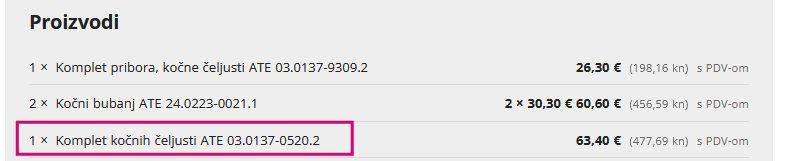 Sa računa: 1 × Komplet kočnih čeljusti ATE 03.0137-0520.2 (63,40 €477,69 kns PDV-om)