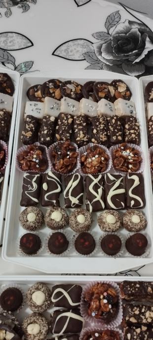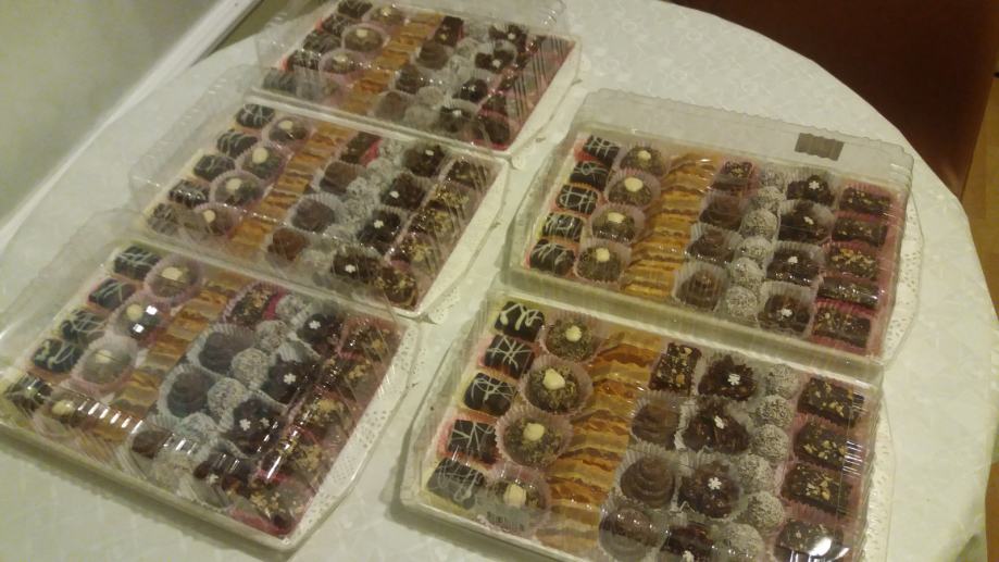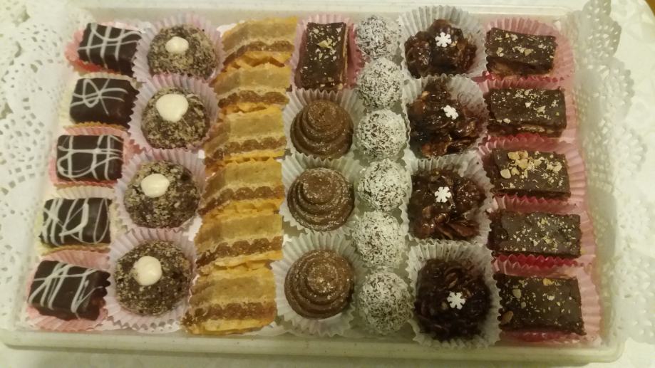 U ponudi bounty, snickers, šišarke, išleri, razne oblatne, čoko salama, čupavci, griote, čokodisk, lešnjak gnezda, esterhazi korpice, kuglice, mađarica, breskvice, šape, mak kiflice i drugi domaći keksi.