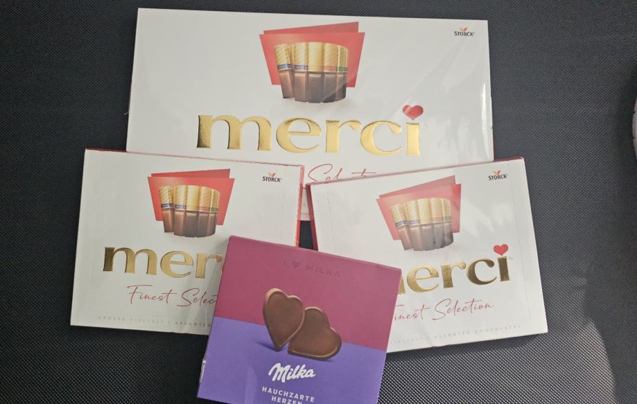Merci 1x 400 g, 2x 250g, Milka 130g.