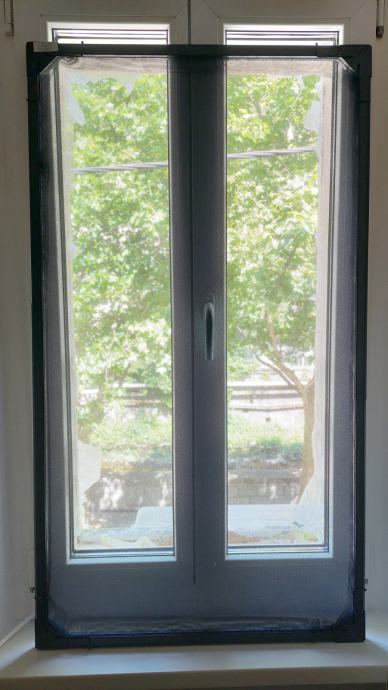 Prodajem komarnik s robusnim teleskopskim alu profilima i elastičnom mrežom koji se može prilagoditi dimenziji prozora širine 70-115 cm i visine 80-135 cm. Profili jednostavno klize i fiksiraju se na potrebnu dimenziju pritiskanjem zapinjača, a komarnik se montira pomoću kukica s oprugom na vanjski rub prozora, tj. zub prozorskog profila, pa nema rezanja, lijepljenja i sl. te se lako demontira. Kupljeno u Lidlu, prodajem zbog preuskog prozora - kriva mjera.