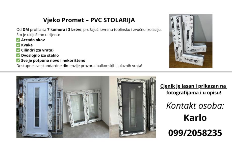 Prodajemo visokokvalitetnu PVC stolariju – idealno rješenje za prozore, balkonska i ulazna vrata. Naša stolarija izrađena je od vrhunskog DM profila sa 7 komora i 3 brtve, pružajući izvrsnu toplinsku i zvučnu izolaciju.