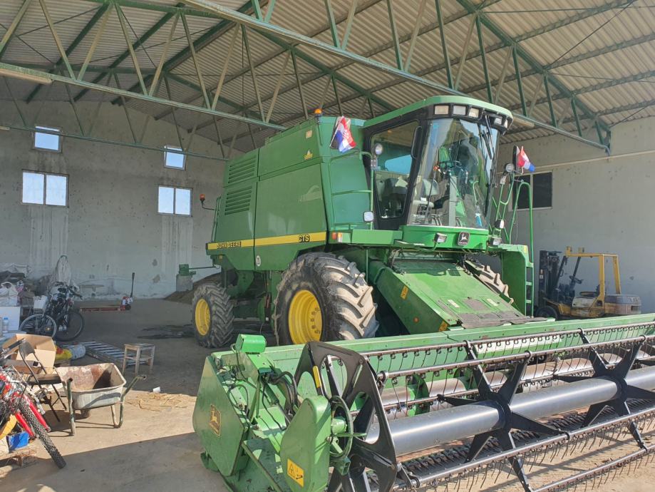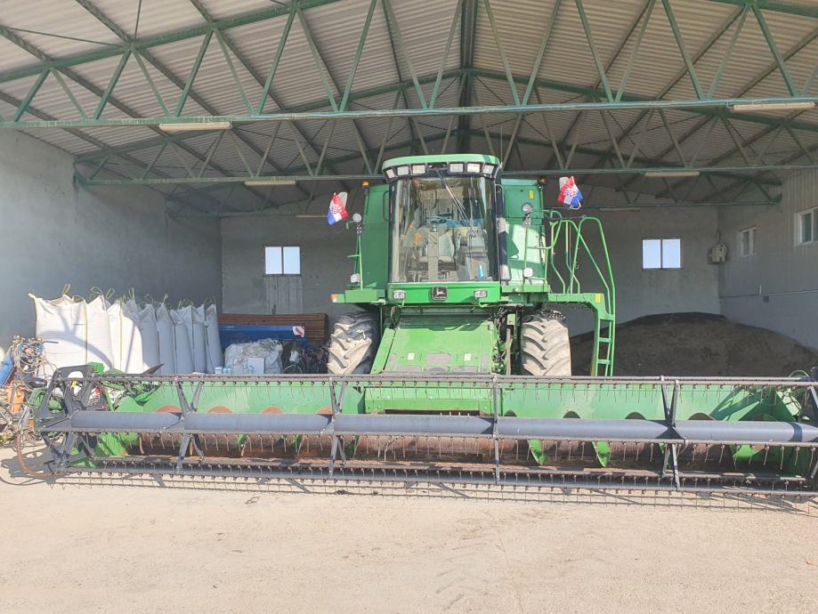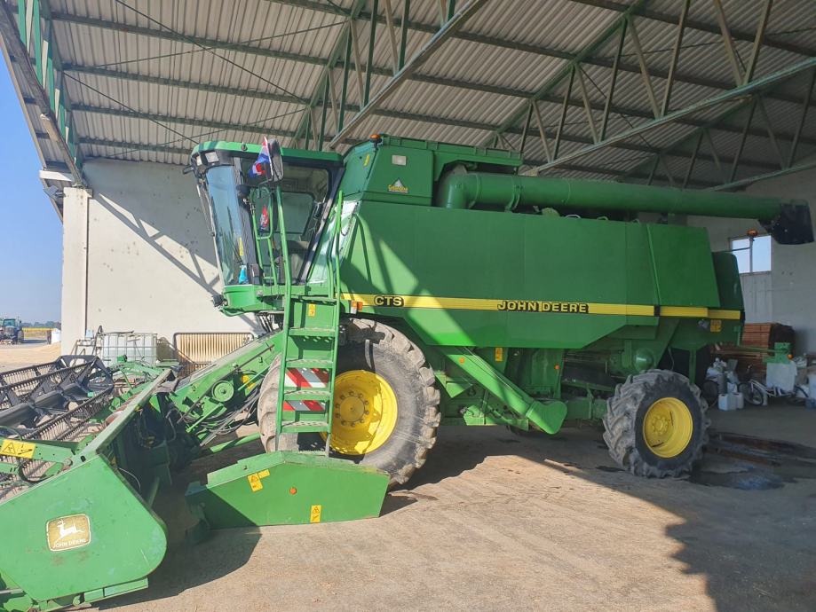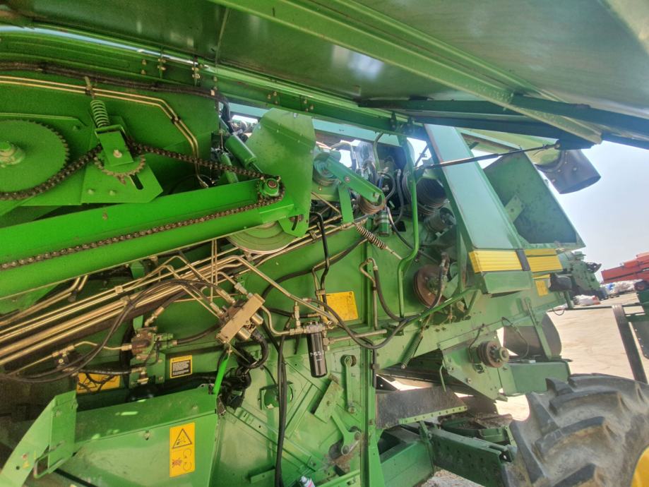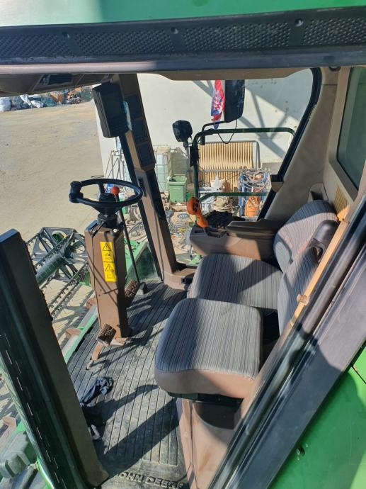 John Deere Deluxe kabina, grijanje, ventilacija, klima uređaj, displej za kontrolu rada kombajna sa indikacijskim i upozoravajućim lampicama na desnom stupu kabine, desni naslon za ruku sa upravljačkim komandama, prekidačima i Master Control upravljačkom ručicom, podesivi upravljač, brisač vjetrobranskog stakla, središnje smješteno sjedalo vozača sa zračnom suspenzijom, suvozačko sjedalo