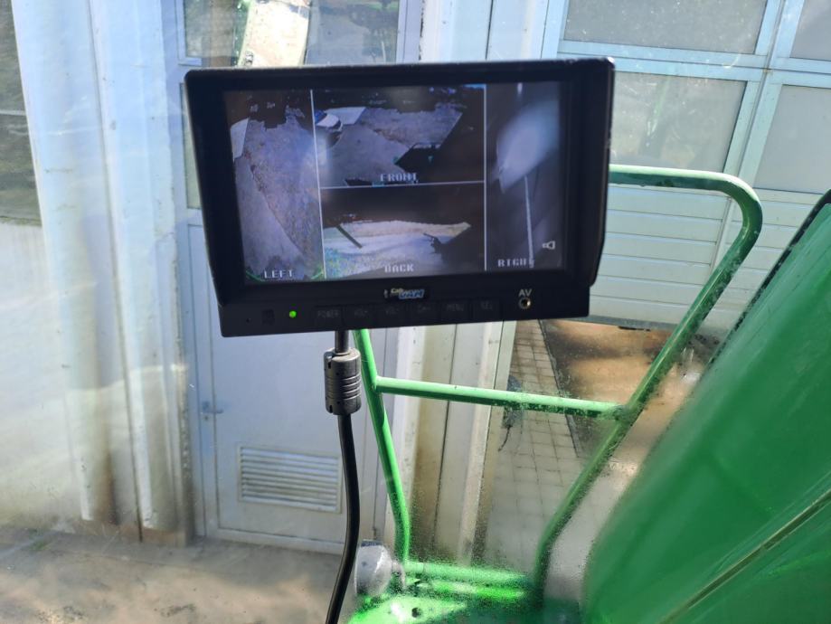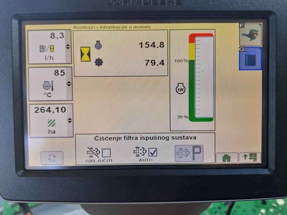 Zaslon na stupu kabine u boji, pokazuje brzinu kretanja kombajna, broj okretaja motora i mjerač snage,
