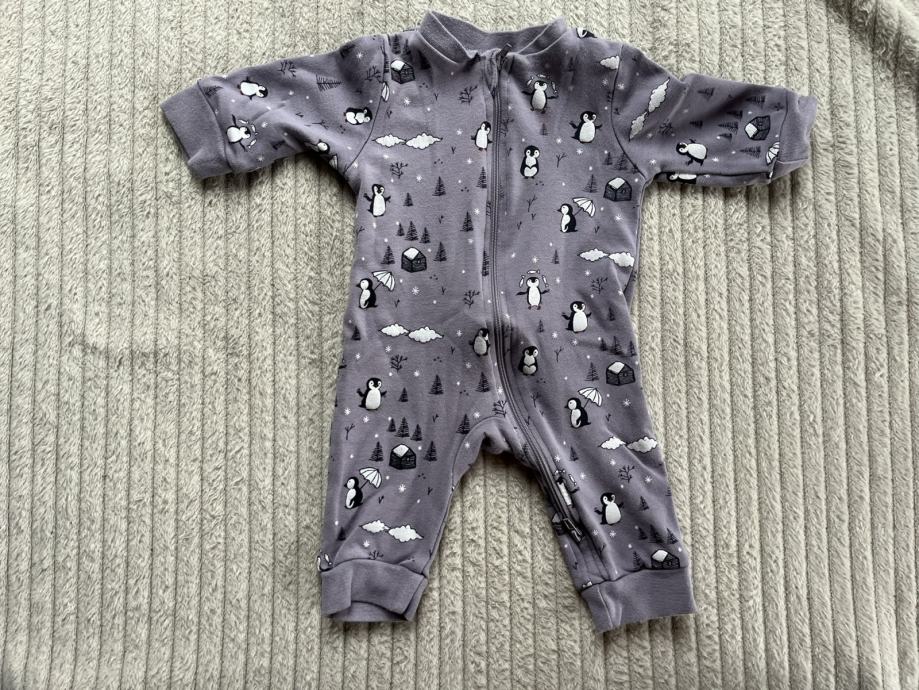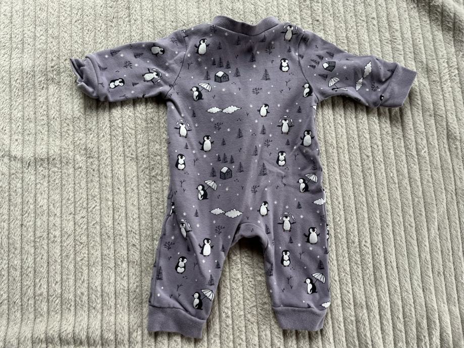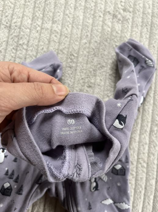 Ljubičasti kombinezon pingvin 60, deklariran kao 0-3 mjeseca. Kiddiezoom