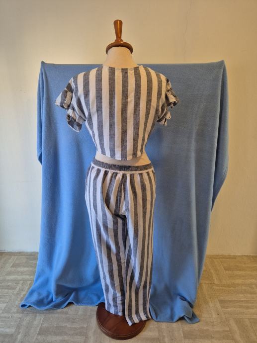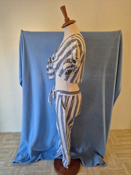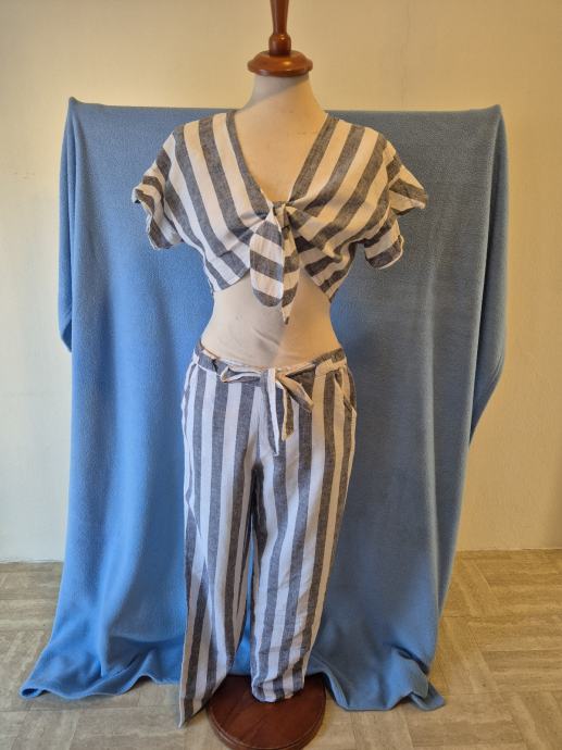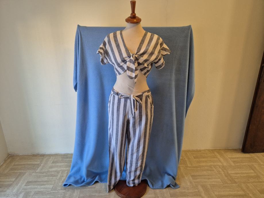 Ljetni laneni komplet Sinsay, vel. XL. Duhe hlače plus košulja na vezanje, top. Potpuno očuvano,vu super stanju. Malo nošeno.