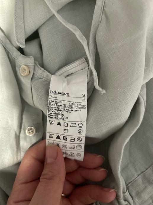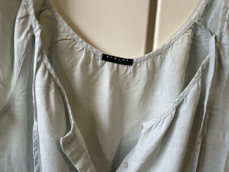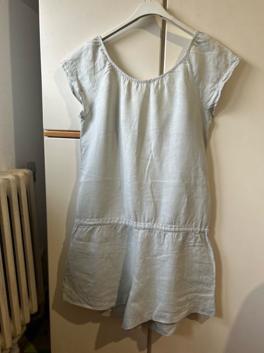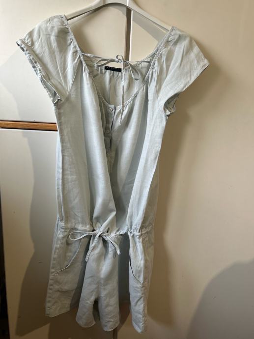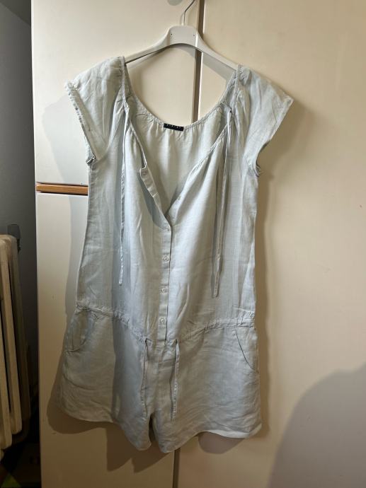 Prodajem Sisley kombinezon od 100% lana, veličine 36 (S/M). Kombinezon je svjetloplave boje, kratkih rukava, s V-izrezom i vezicama na dekolteu te pojasom koji se veže u struku. Ima bočne džepove i kopčanje na prednjoj strani. Lan je prirodni materijal koji je ugodan za nošenje u toplijem vremenu.