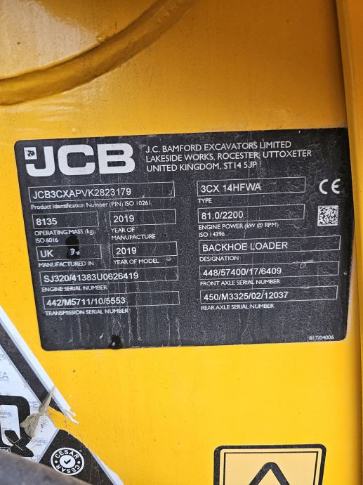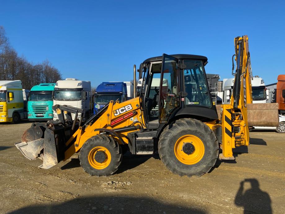 Bager JCB 3CX CONTRACTOR PRO, u prometu od 2019 god, 5.670 radnih sati, Euro4, snaga: 81 kW, turbo diesel motor, klima uređaj u kabini, powershift, blokada momenta, joystick komande, instalacija za čekić, powerslide, hidraulička brza spojka, radio, signalizacija, dimenzije vozila (DxŠxV): 5.620 mm x 2.350 mm x 2.980 mm, masa praznog vozila: 8.135 kg, nove gume, planirna korpa 1.525 mm, žlica kopajuća 305 mm nova, žlica kopajuća pojačana 610 mm, žlica kopajuća 800 mm - nova. VIN: JCB3CXAPVK2823179