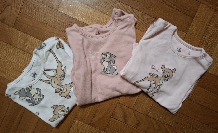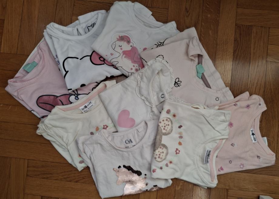 Poklanjam komplet robice za bebu djevojčicu, vel. 86/92, 18-24 mjeseci. Komplet sadržava majice kratkih i dugih rukava, trenirke, hlače, hlače sa stopalicama, bodije dugih i kratkih rukava te s naramenicama, veste itd. Većina robice je vrlo malo nošena, a dio i nov (bez etikete). Sastav većine odjeće: 100 % pamuk. Dio odjevnih predmeta vidljiv je na priloženim fotografijama.