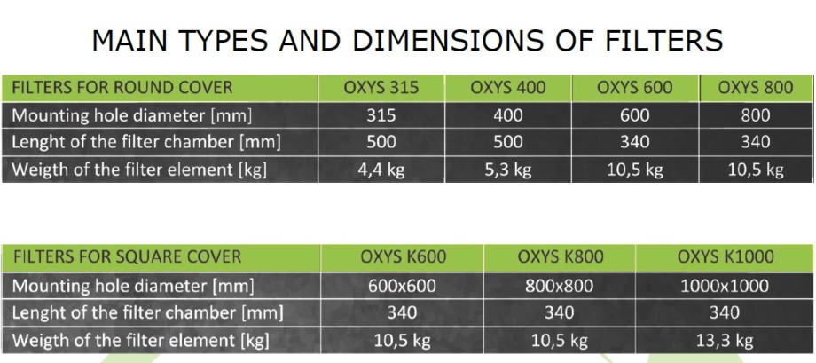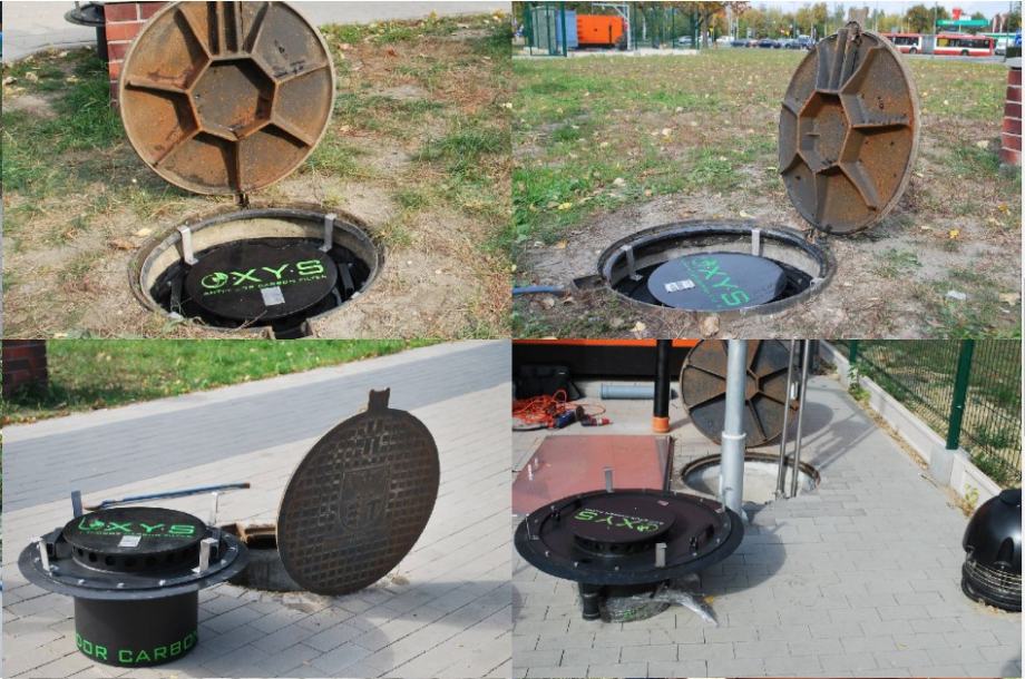 Dakle može se montirati na bilo koji šaht od kanalizacije, septičke jame, odvodnje oborinskih voda, na parkiralištu, prometnici,... Unutar kućišta se nalazi karbonski filter (uložak) koji se nakon 1-2 godine mijenja i jednostavno ga je zamijeniti. Filtera ima više veličina i mogu biti okrugli ili četvrtasti (standardno prema šahtovima). Imamo i filtere za oduške od septičkih jama, pumpnih stanica kanalizacije itd. (promjer ugradnje 110 i 160 mm).