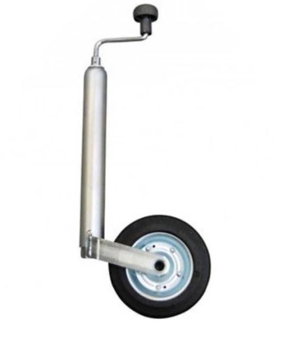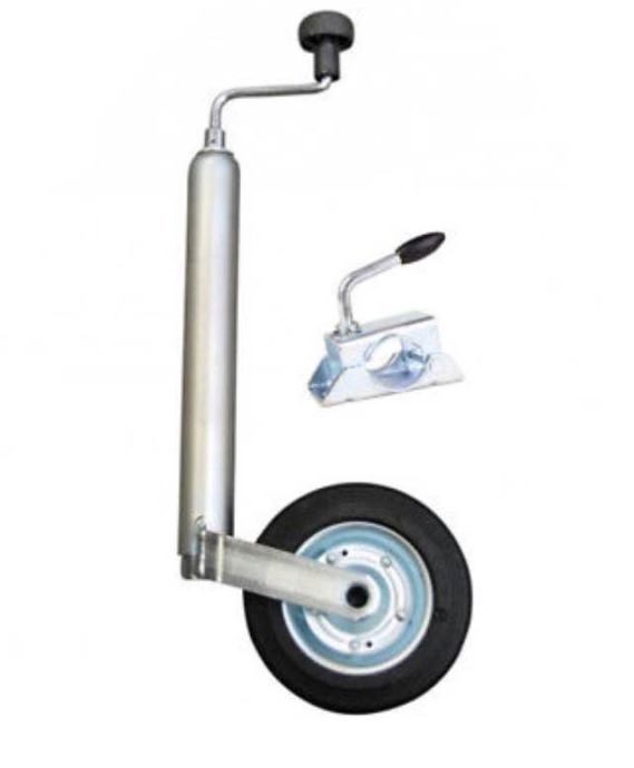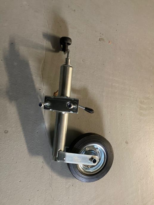 Prodajem pomoćni kotač s kurblom za prikolicu u setu (potporni kotač + šelna/držač stezaljki fi48 s dva vijka M10x30, podloška M10 i matica M10) za nosivost do 150 kg.