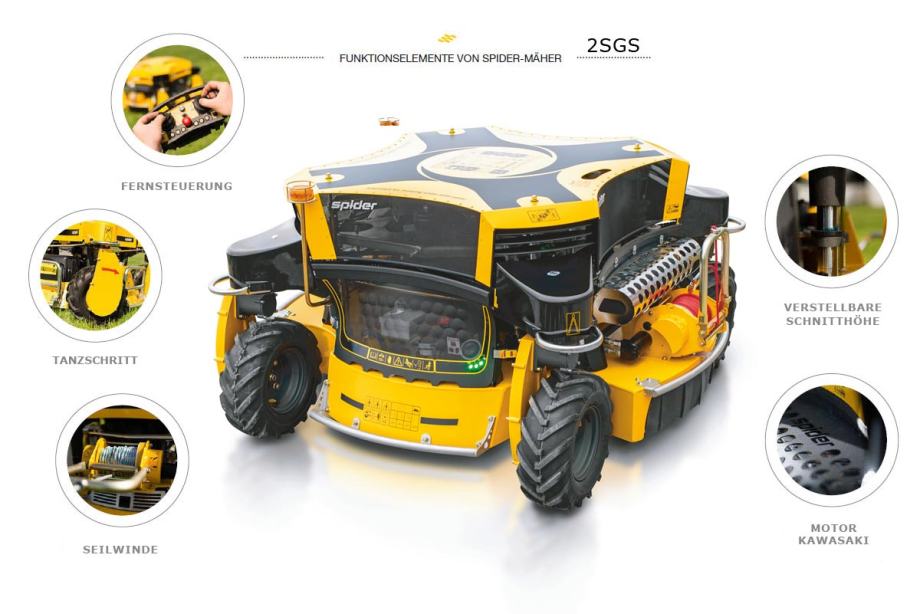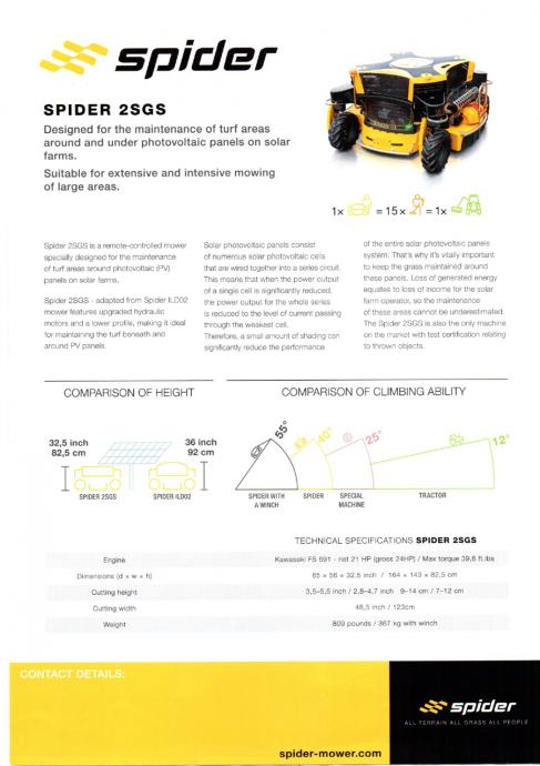 Spider 2SGS daljinski je upravljana kosilica, posebno dizajnirana za održavanje travnjaka ispod i oko solarnih panela na solarnim farmama. Trenutno je jedina takva kosilica na tržištu. Ovaj stroj može se koristiti profesionalno za intenzivnu košnju velikih površina. Jedna od namjenskih primjena ovoga stroja jest i održavanje uvučenih i nepristupačnih terena s padinama do 55 stupnjeva (uz korištenje integriranog zaštitnog vitla). S učinkovitošću i do 7000 kvadratnih metara pokošenih na sat (0.7 hektara na sat), Spider 2SGS može - pri znatno nižim operativnim troškovima - parirati učinku od petnaestero radnika na trimerima.