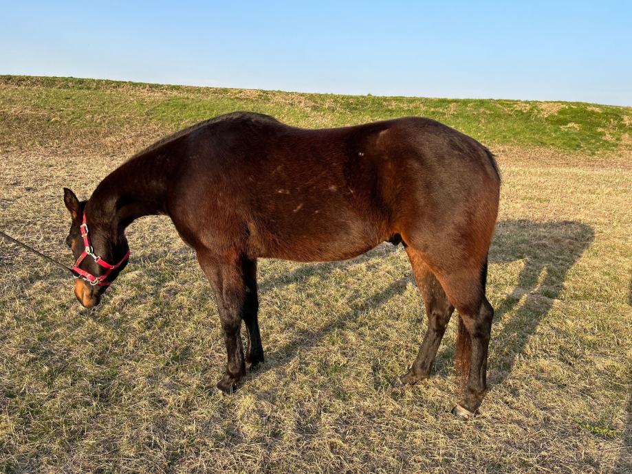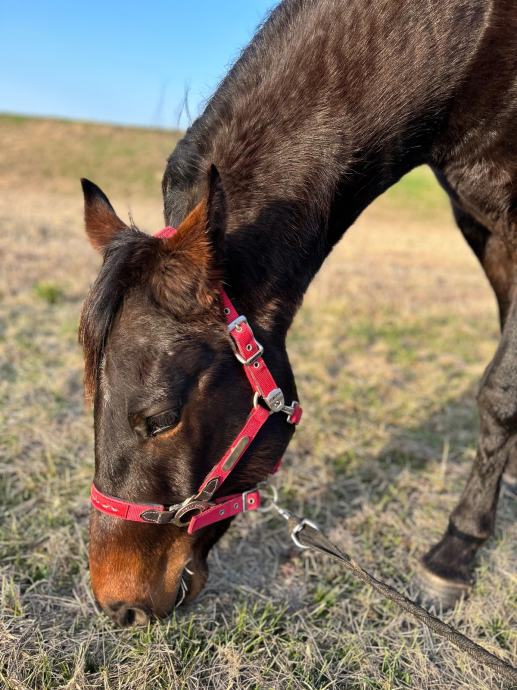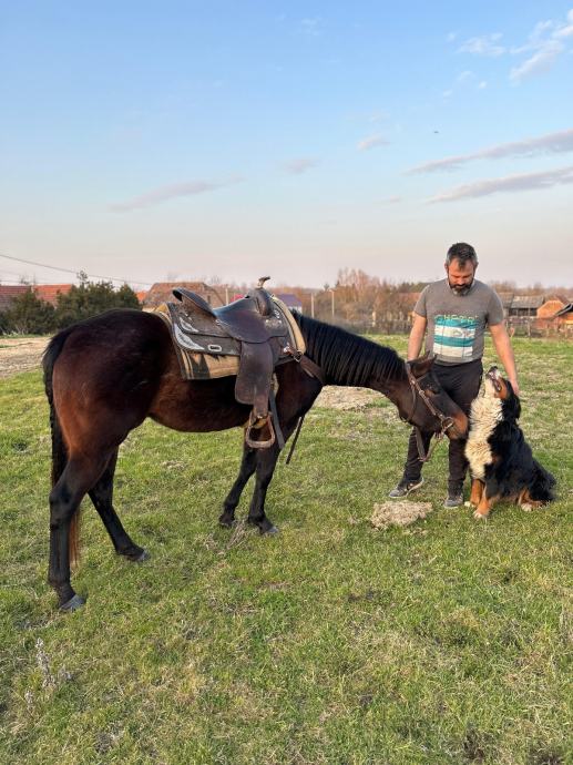 Američki quarter konj s urednom dokumentacijom . Miran , ujahan , iznimno orijentiran na ljude . Star 4 godine . Radne genetike . Moguća zamjena za rasplodnu kobilu iste pasmine