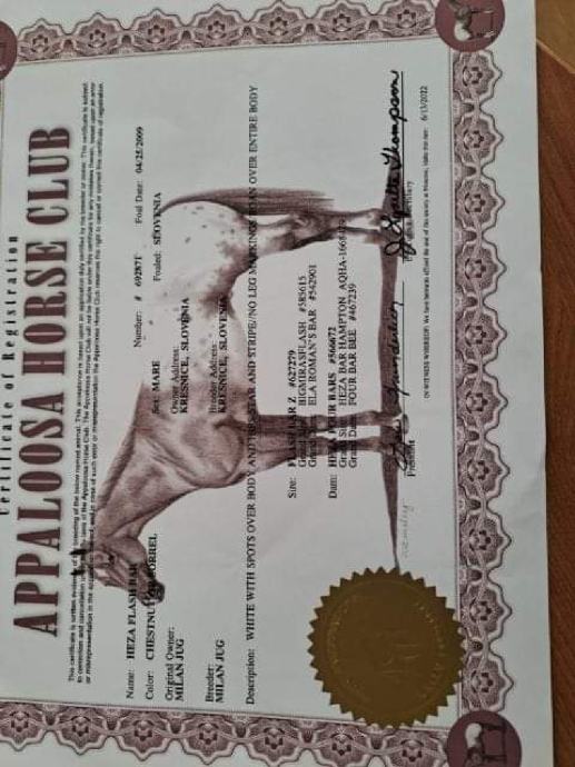 Apaluza kobila sa američkim i hrvatskim papirima . Mirna , jase se ,pripuštena ,potvrđeno ždrebna .Prilika za nekoga tko se želi baviti uzgojem ovih konja